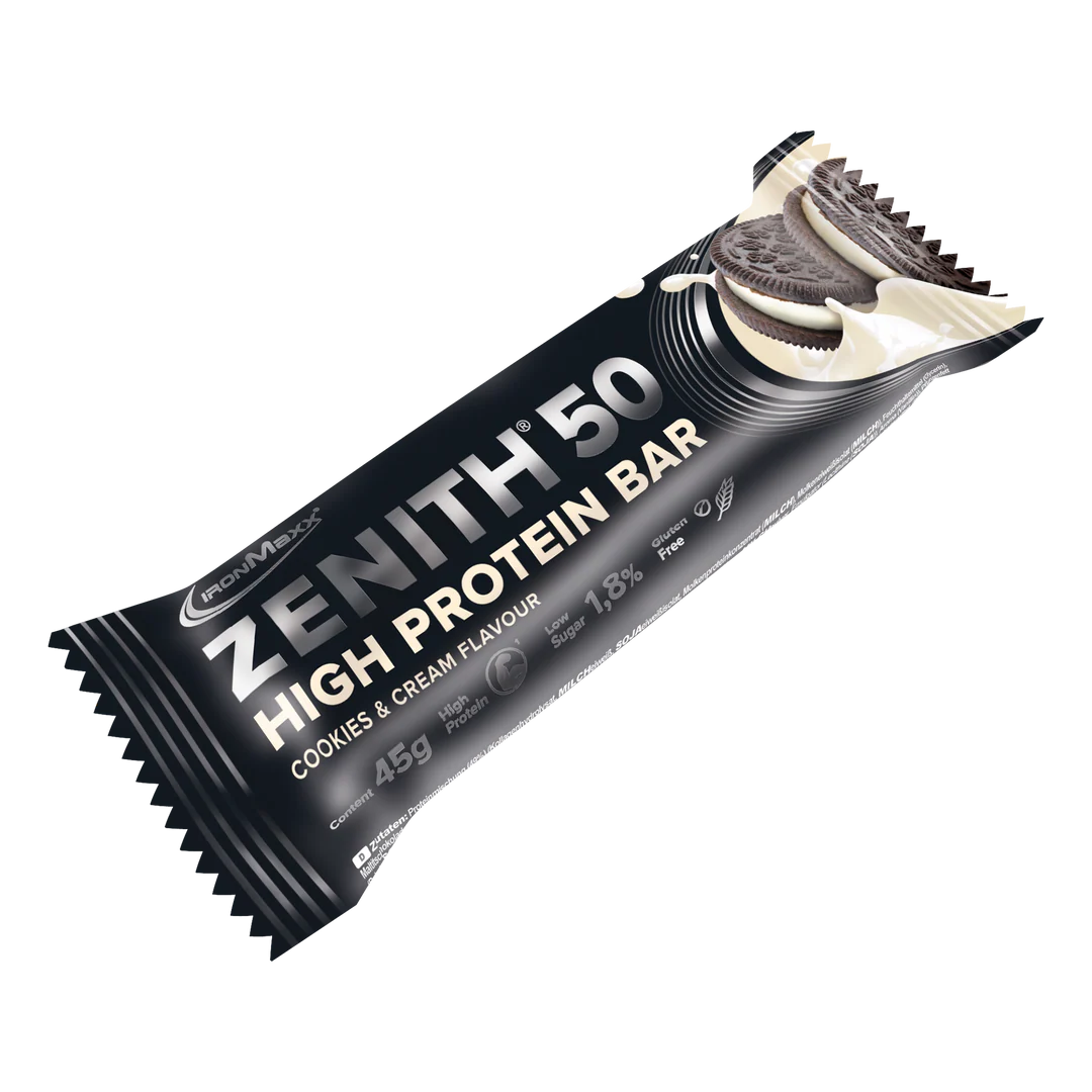 „IronMaxx® ZENITH® 50“ didelio baltymų kiekio batonėlyje yra 23 g baltymų ir daugiausia 1,1 g cukraus. Dėl išmanaus pieno, išrūgų ir sojų baltymų mišinio jis id